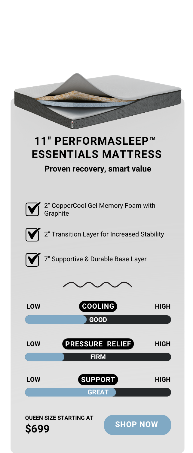 Those who want dependable comfort and support at an affordable price love the PerformaSleep™ Essentials. Perfect for budget-friendly shoppers, guest rooms, students, or anyone seeking a high-quality mattress without extra frills.