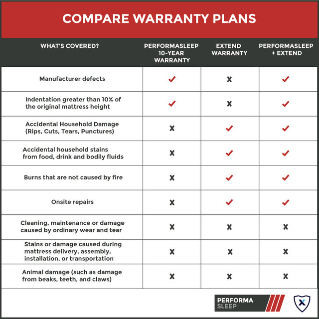 PerformaSleep™ offers a 10-year limited warranty to the original purchaser of the mattress. Proof of purchase and validation of date of purchase are required for processing any claims. Warranty is non transferable.