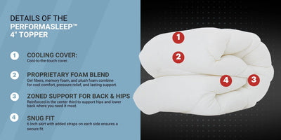 The PerformaSleep™ 4" Topper is built to take your mattress from “fine” to “fantastic.” Crafted with a proprietary blend of gel fibers, breathable memory foam, and plush conventional foam, it delivers cooling, contouring, and targeted support where you need it most.